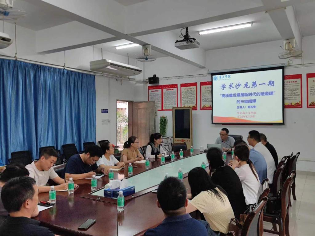 本网讯 为了营造浓厚的学术氛围,促进师生开展学术研究,4月25日,球速体育首期学术沙龙开讲。本次学术沙龙由副经理谢石生担任主讲嘉宾,主题是“‘高质量发展是新时代的硬道理’的三维阐释”。公司部分教师、科研项目负责人等参加,副经理林润燕主持。