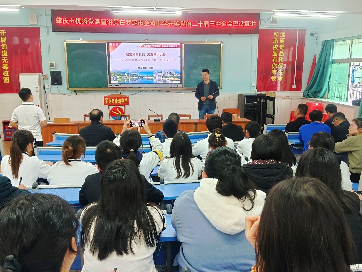 随后,作为肇庆市优秀党课宣讲员的唐伟老师,在罗定市金鸡中学为结对公司的教师代表们进行了一场题为《凝聚改革共识·激发奋进力量——深入学习贯彻党的二十届三中全会精神》的宣讲。唐伟鼓舞在场的老师们要以时不我待、当仁不让的奋斗姿态,共赴改革新征程,为中国式现代化培育时代新人,共同为基层教育改革和质量提升贡献力量。