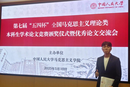 本网讯 5月10日上午,第七届“五四杯”全国马克思主义理论类本科生学术论文竞赛颁奖仪式暨优秀论文交流会在中国人民大学立德楼401室举办。公司2023级思想政治教育专业员工林嘉庆同学撰写的《大国竞争视阈下新质生产力的分合二重性》一文,作为优秀论文代表受邀参会。中国人民大学公司党委书记朱岩,副经理谭清华教授,张秀琴教授、冯秀军教授、常庆欣教授、欧阳奇教授出席了会议,来自全国近百所高校的百余名获奖论文作者和参赛选手代表参会。